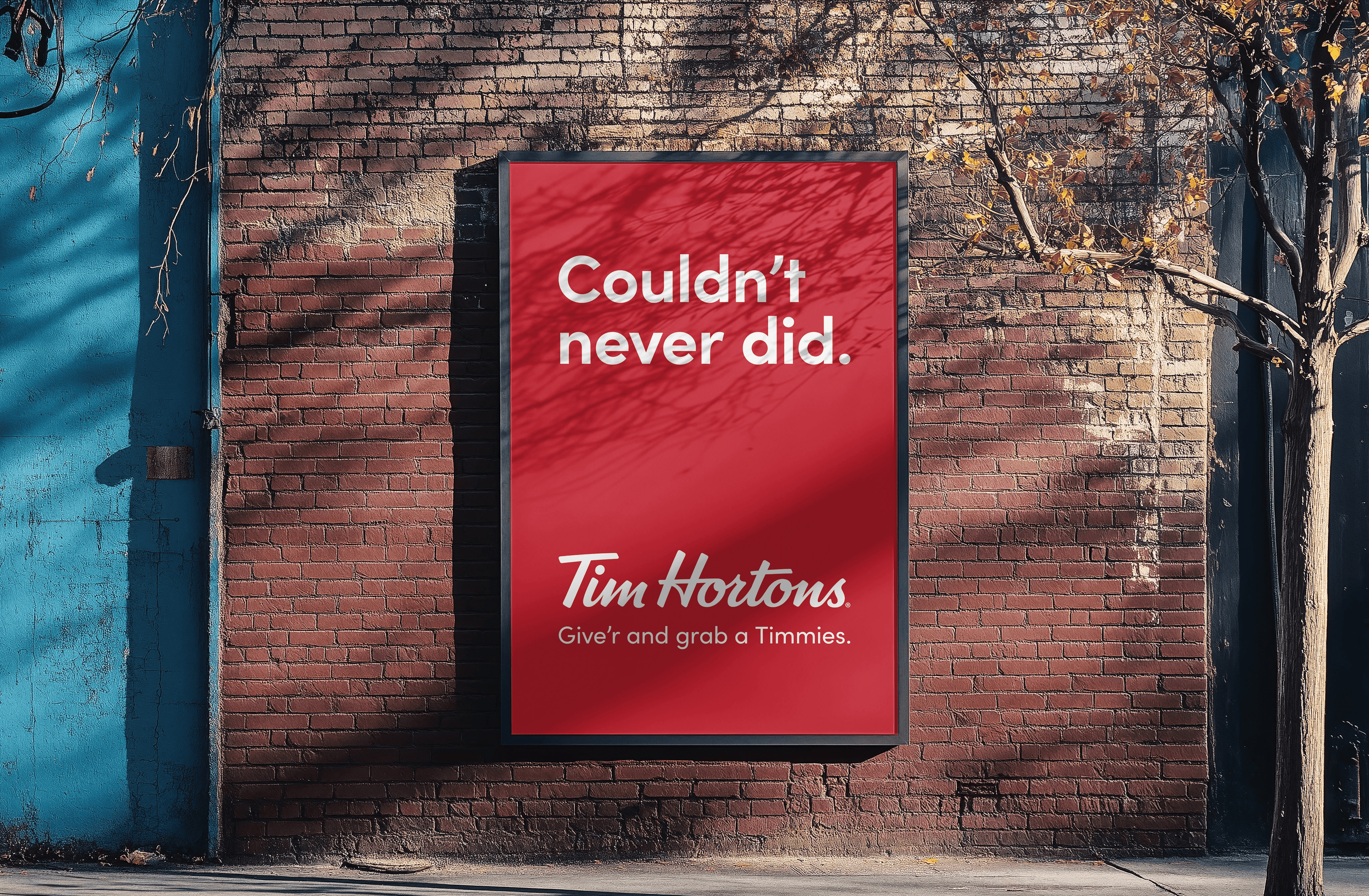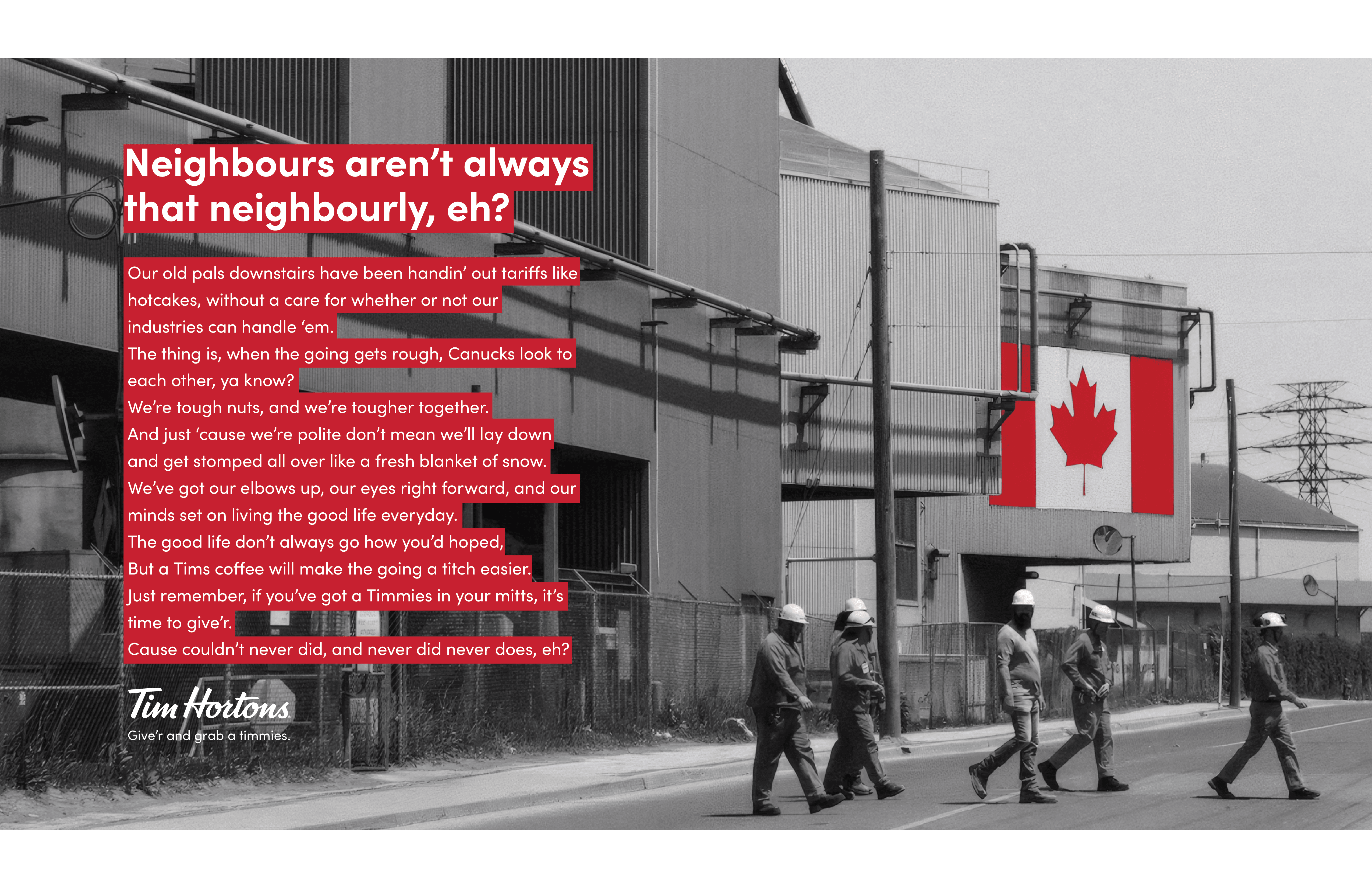 With tariffs being slapped on everything coming out of the Maple Leaf, Canadians have had a rocky 2025. This chaos has created the perfect opportunity for Canadian icon Tim Hortons to do what they do best: perk the nation back up. “Give’r and Grab a Timmies” is a campaign for Canadians, written IN Canadian. When Canucks “give’r” (or “just do it” in American) they show the globe that the Maple Leaf isn’t just surviving, but THRIVING in the face of tariff-induced betrayal.